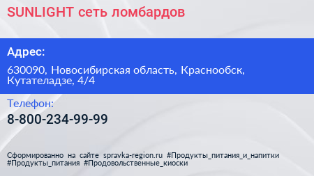 SUNLIGHT, сеть ломбардов по адресу 630090, Новосибирская область, Краснообск, Кутателадзе, 4/4 в дальнейшем Организация, размещена в следующих категориях: