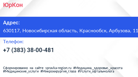 ЮрКон по адресу 630117, Новосибирская область, Краснообск, Арбузова, 11 в дальнейшем Организация, размещена в следующих категориях: