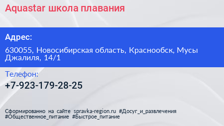 Aquastar, школа плавания по адресу 630055, Новосибирская область, Краснообск, Мусы Джалиля, 14/1 в дальнейшем Организация, размещена в следующих категориях: