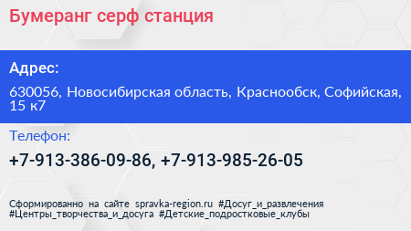 Бумеранг, серф-станция по адресу 630056, Новосибирская область, Краснообск, Софийская, 15 к7 в дальнейшем Организация, размещена в следующих категориях: