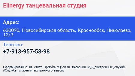 Elinergy, танцевальная студия по адресу 630090, Новосибирская область, Краснообск, Николаева, 12/3 в дальнейшем Организация, размещена в следующих категориях: