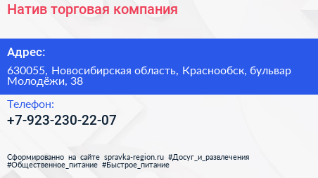 Натив, торговая компания по адресу 630055, Новосибирская область, Краснообск, бульвар Молодёжи, 38 в дальнейшем Организация, размещена в следующих категориях: