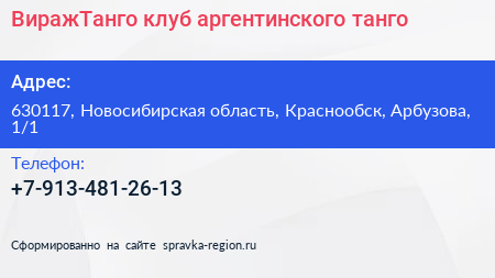 ВиражТанго, клуб аргентинского танго по адресу 630117, Новосибирская область, Краснообск, Арбузова, 1/1 в дальнейшем Организация, размещена в следующих категориях:
