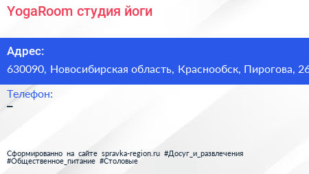YogaRoom, студия йоги по адресу 630090, Новосибирская область, Краснообск, Пирогова, 26 в дальнейшем Организация, размещена в следующих категориях: