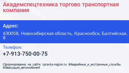 Академспецтехника, торгово-транспортная компания по адресу 630058, Новосибирская область, Краснообск, Балтийская, 8 в дальнейшем Организация, размещена в следующих категориях: