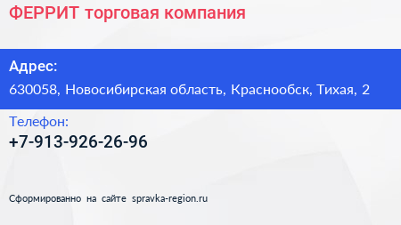ФЕРРИТ, торговая компания по адресу 630058, Новосибирская область, Краснообск, Тихая, 2 в дальнейшем Организация, размещена в следующих категориях: