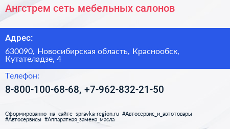 Ангстрем, сеть мебельных салонов по адресу 630090, Новосибирская область, Краснообск, Кутателадзе, 4 в дальнейшем Организация, размещена в следующих категориях: