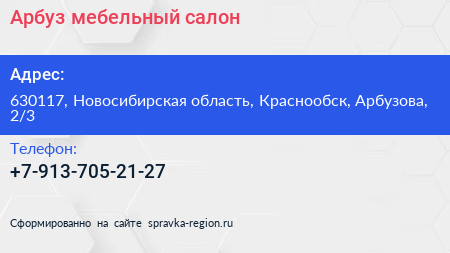 Арбуз, мебельный салон по адресу 630117, Новосибирская область, Краснообск, Арбузова, 2/3 в дальнейшем Организация, размещена в следующих категориях:
