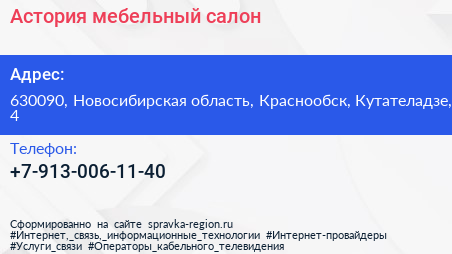 Астория, мебельный салон по адресу 630090, Новосибирская область, Краснообск, Кутателадзе, 4 в дальнейшем Организация, размещена в следующих категориях: