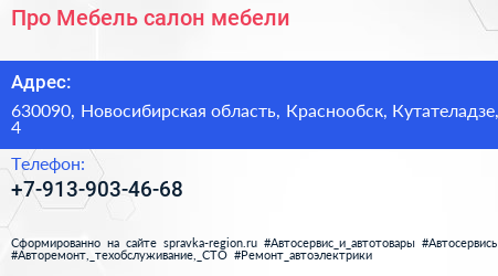 Про Мебель, салон мебели по адресу 630090, Новосибирская область, Краснообск, Кутателадзе, 4 в дальнейшем Организация, размещена в следующих категориях: