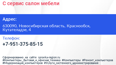 С-сервис, салон мебели по адресу 630090, Новосибирская область, Краснообск, Кутателадзе, 4 в дальнейшем Организация, размещена в следующих категориях: