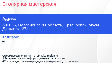 Столярная мастерская по адресу 630055, Новосибирская область, Краснообск, Мусы Джалиля, 27а в дальнейшем Организация, размещена в следующих категориях: