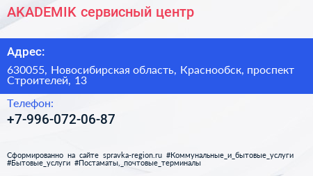 AKADEMIK, сервисный центр по адресу 630055, Новосибирская область, Краснообск, проспект Строителей, 13 в дальнейшем Организация, размещена в следующих категориях: