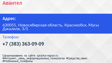 Авантел по адресу 630055, Новосибирская область, Краснообск, Мусы Джалиля, 3/1 в дальнейшем Организация, размещена в следующих категориях: