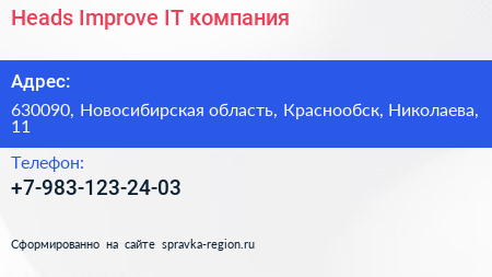 Heads & Improve, IT-компания по адресу 630090, Новосибирская область, Краснообск, Николаева, 11 в дальнейшем Организация, размещена в следующих категориях: