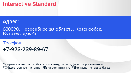 Interactive Standard по адресу 630090, Новосибирская область, Краснообск, Кутателадзе, 4г в дальнейшем Организация, размещена в следующих категориях: