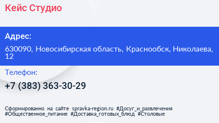 Кейс Студио по адресу 630090, Новосибирская область, Краснообск, Николаева, 12 в дальнейшем Организация, размещена в следующих категориях: