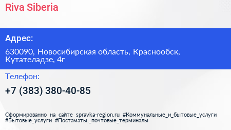 Riva Siberia по адресу 630090, Новосибирская область, Краснообск, Кутателадзе, 4г в дальнейшем Организация, размещена в следующих категориях: