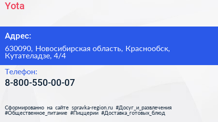 Yota по адресу 630090, Новосибирская область, Краснообск, Кутателадзе, 4/4 в дальнейшем Организация, размещена в следующих категориях: