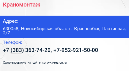 Краномонтаж по адресу 630058, Новосибирская область, Краснообск, Плотинная, 2/7 в дальнейшем Организация, размещена в следующих категориях: