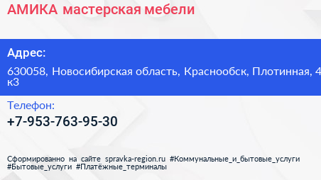 АМИКА, мастерская мебели по адресу 630058, Новосибирская область, Краснообск, Плотинная, 4 к3 в дальнейшем Организация, размещена в следующих категориях: