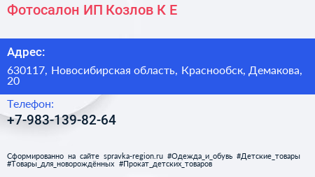 Фотосалон, ИП Козлов К.Е. по адресу 630117, Новосибирская область, Краснообск, Демакова, 20 в дальнейшем Организация, размещена в следующих категориях: