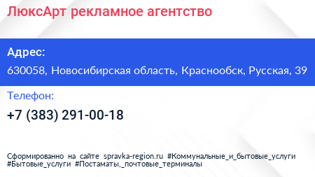 ЛюксАрт, рекламное агентство по адресу 630058, Новосибирская область, Краснообск, Русская, 39 в дальнейшем Организация, размещена в следующих категориях: