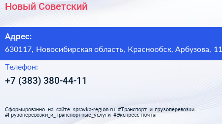 Новый Советский по адресу 630117, Новосибирская область, Краснообск, Арбузова, 11 в дальнейшем Организация, размещена в следующих категориях:
