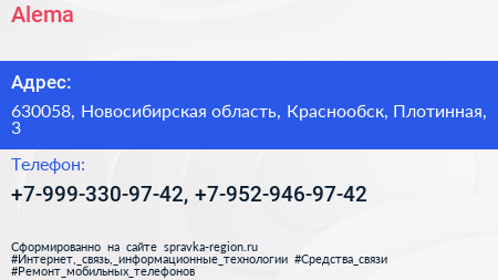Alema по адресу 630058, Новосибирская область, Краснообск, Плотинная, 3 в дальнейшем Организация, размещена в следующих категориях:
