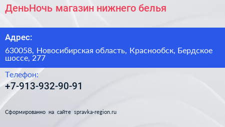 ДеньНочь, магазин нижнего белья по адресу 630058, Новосибирская область, Краснообск, Бердское шоссе, 277 в дальнейшем Организация, размещена в следующих категориях:
