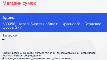 Магазин сумок по адресу 630058, Новосибирская область, Краснообск, Бердское шоссе, 277 в дальнейшем Организация, размещена в следующих категориях: