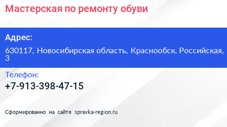 Мастерская по ремонту обуви по адресу 630117, Новосибирская область, Краснообск, Российская, 3 в дальнейшем Организация, размещена в следующих категориях:
