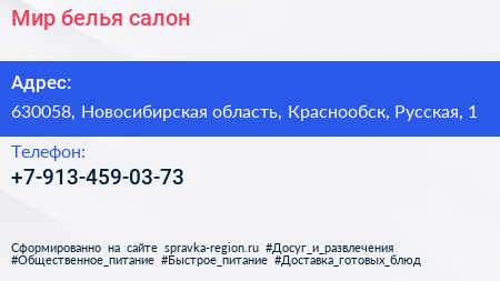 Мир белья, салон по адресу 630058, Новосибирская область, Краснообск, Русская, 1 в дальнейшем Организация, размещена в следующих категориях: