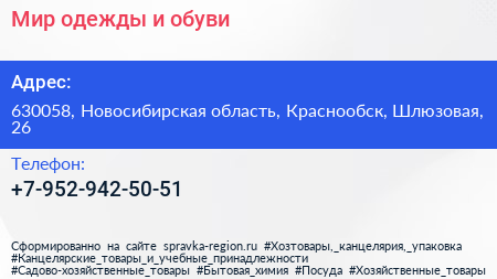 Мир одежды и обуви по адресу 630058, Новосибирская область, Краснообск, Шлюзовая, 26 в дальнейшем Организация, размещена в следующих категориях: