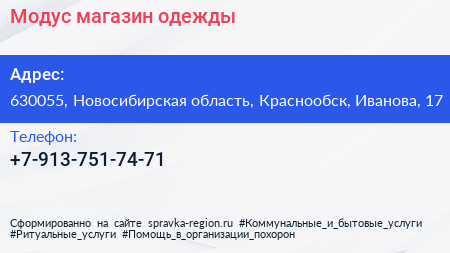 Модус, магазин одежды по адресу 630055, Новосибирская область, Краснообск, Иванова, 17 в дальнейшем Организация, размещена в следующих категориях: