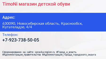TimoNi, магазин детской обуви по адресу 630090, Новосибирская область, Краснообск, Кутателадзе, 4/4 в дальнейшем Организация, размещена в следующих категориях:
