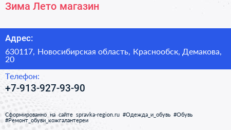 Зима-Лето, магазин по адресу 630117, Новосибирская область, Краснообск, Демакова, 20 в дальнейшем Организация, размещена в следующих категориях:
