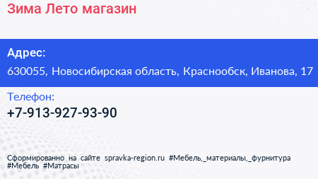Зима-Лето, магазин по адресу 630055, Новосибирская область, Краснообск, Иванова, 17 в дальнейшем Организация, размещена в следующих категориях: