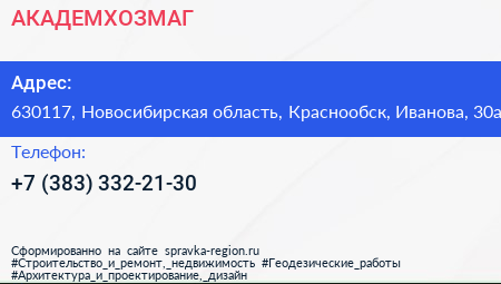 АКАДЕМХОЗМАГ по адресу 630117, Новосибирская область, Краснообск, Иванова, 30а в дальнейшем Организация, размещена в следующих категориях: