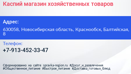 Каспий, магазин хозяйственных товаров по адресу 630058, Новосибирская область, Краснообск, Балтийская, 8 в дальнейшем Организация, размещена в следующих категориях: