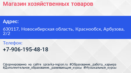 Магазин хозяйственных товаров по адресу 630117, Новосибирская область, Краснообск, Арбузова, 2/2 в дальнейшем Организация, размещена в следующих категориях: