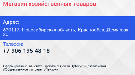 Магазин хозяйственных товаров по адресу 630117, Новосибирская область, Краснообск, Демакова, 20 в дальнейшем Организация, размещена в следующих категориях: