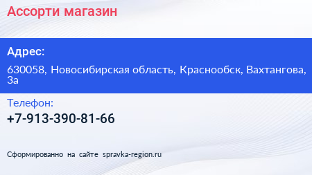 Ассорти, магазин по адресу 630058, Новосибирская область, Краснообск, Вахтангова, 3а в дальнейшем Организация, размещена в следующих категориях: