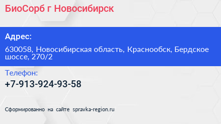 БиоСорб, г. Новосибирск по адресу 630058, Новосибирская область, Краснообск, Бердское шоссе, 270/2 в дальнейшем Организация, размещена в следующих категориях: