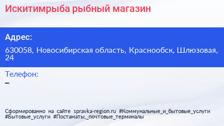 Искитимрыба, рыбный магазин по адресу 630058, Новосибирская область, Краснообск, Шлюзовая, 24 в дальнейшем Организация, размещена в следующих категориях: