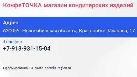 КонфеТОЧКА, магазин кондитерских изделий по адресу 630055, Новосибирская область, Краснообск, Иванова, 17 в дальнейшем Организация, размещена в следующих категориях: