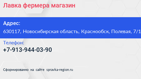 Лавка фермера, магазин по адресу 630117, Новосибирская область, Краснообск, Полевая, 7/1 в дальнейшем Организация, размещена в следующих категориях: