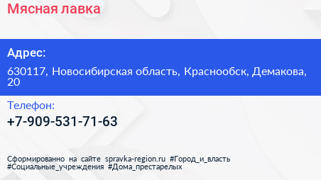 Мясная лавка по адресу 630117, Новосибирская область, Краснообск, Демакова, 20 в дальнейшем Организация, размещена в следующих категориях: