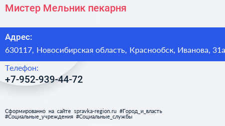 Мистер Мельник, пекарня по адресу 630117, Новосибирская область, Краснообск, Иванова, 31а в дальнейшем Организация, размещена в следующих категориях: