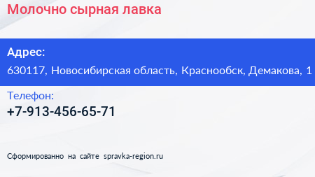 Молочно-сырная лавка по адресу 630117, Новосибирская область, Краснообск, Демакова, 1 в дальнейшем Организация, размещена в следующих категориях: